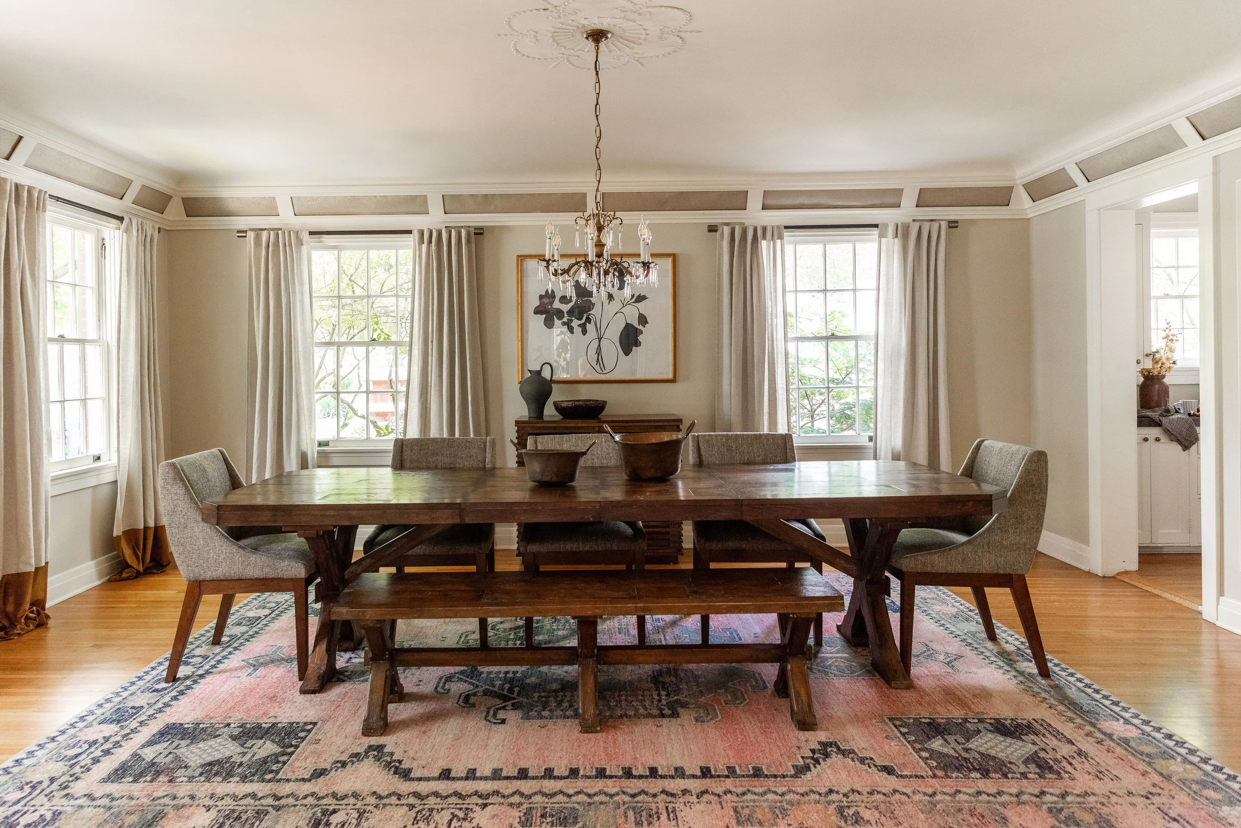 Original floors & lighting were paired with new furnishings and window treatments to turn this dining room into an entertainer’s dream. The millwork around the ceiling contains old florescent lighting that we did not want to remove. In order to keep the original carpentry work intact. I selected a neutral toned wallpaper with a glimpse of shiny texture and covered the glass panels! I wanted to the detail to be timeless, and it turned out to be a focal point in this historic dining room.