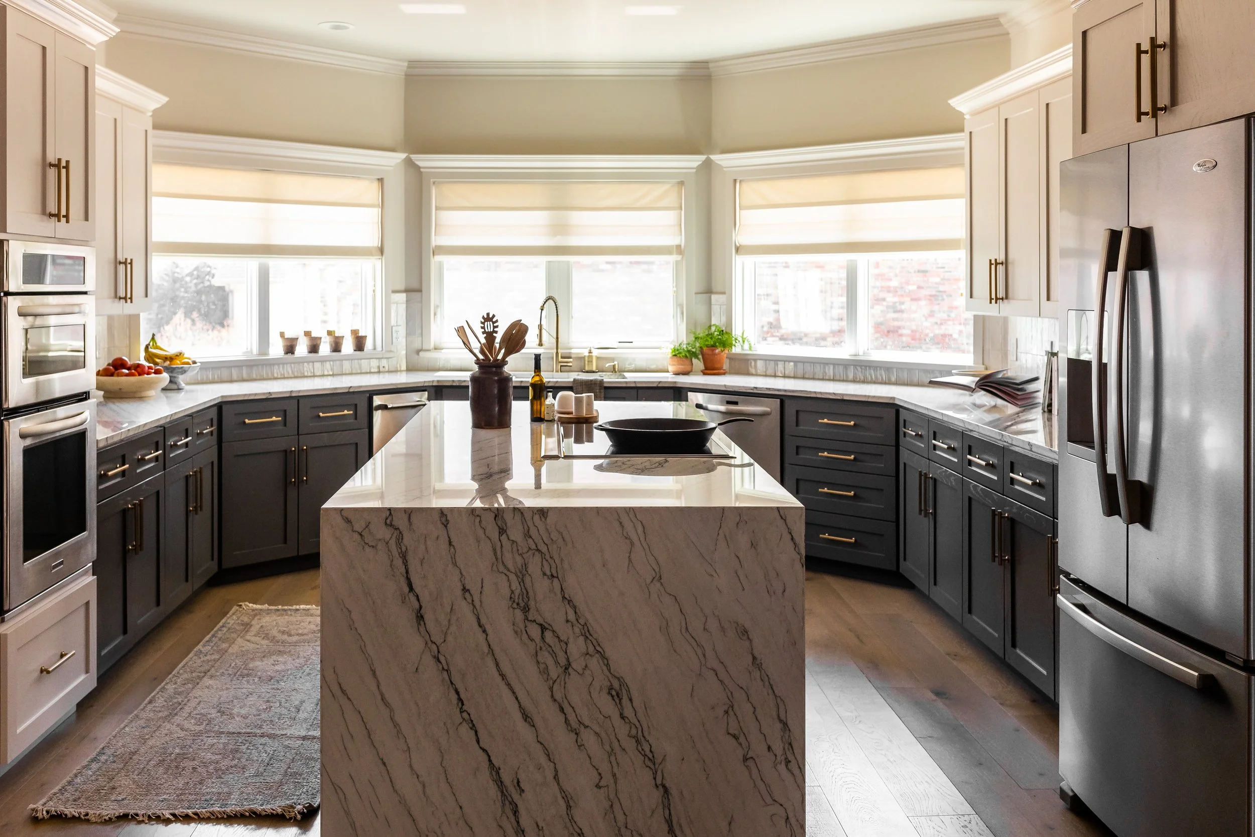 The kitchen design was a two- toned approach. The dark navy lower cabinetry anchors the space and keeps consistent with darker hues throughout the home, while the brighter upper cabinetry provides contrast and the airy feelings of a breezy, white kitchen up top. We love simplicity of the tailored, custom shades, too!